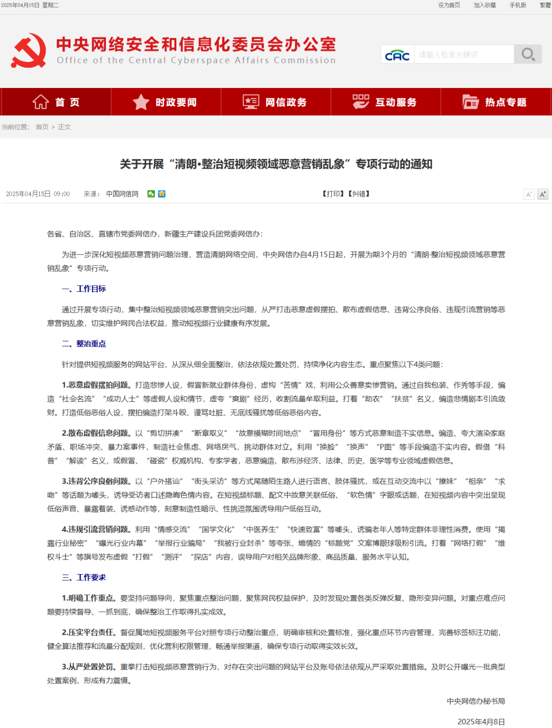 压实平台责任。督促属地短视频服务平台对照专项行动整治重点,明确审核和处置标准,强化重点环节内容管理,完善标签标注功能,健全算法推荐和流量分配规则,优化营利权限管理,畅通举报渠道,确保专项行动取得实效长效。
